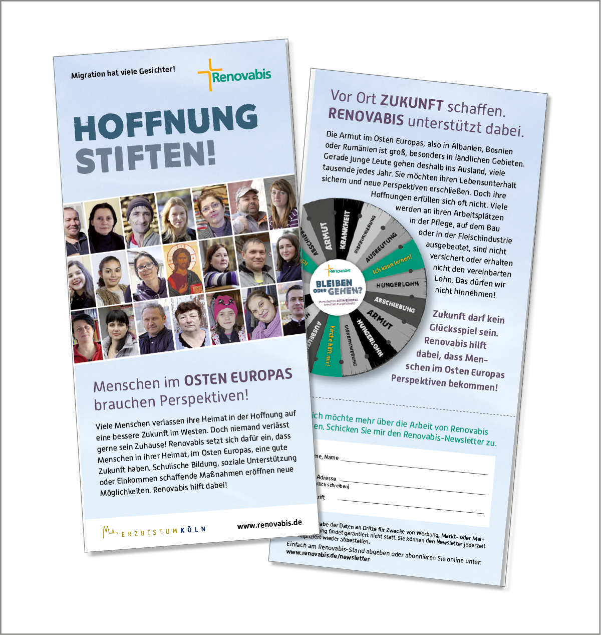 Das Erzbistum Köln ist nicht nur eines der ältesten, sondern mit seinen über zwei Millionen Katholiken auch das größte Bistum im deutschsprachigen Raum. In den vergangenen Jahrhunderten wurde in der Kommunikation hauptsächlich das Bistumswappen genutzt, bis wir die Aufgabe bekamen, ein neues Logo zu gestalten. Am Ende des von uns begleiteten, dreijährigen Prozesses, bei dem Mitarbeiterinnen und Mitarbeiter der verschiedenen Abteilungen des Generalvikariats Köln beteiligt waren, stand die Entscheidung für die Wort-Bild-Marke mit Dom. Im Anschluss daran erarbeiteten wir ein auf das Logo abgestimmtes vollständiges Corporate Design. Seither begleiten wir verschiedene Abteilungen des Erzbistums in kommunikativen Fragen, so z.B. die Presseabteilung, mit der wir gemeinsam die Eröffnung der Renovabis-Kampagne 2017 durchführten.