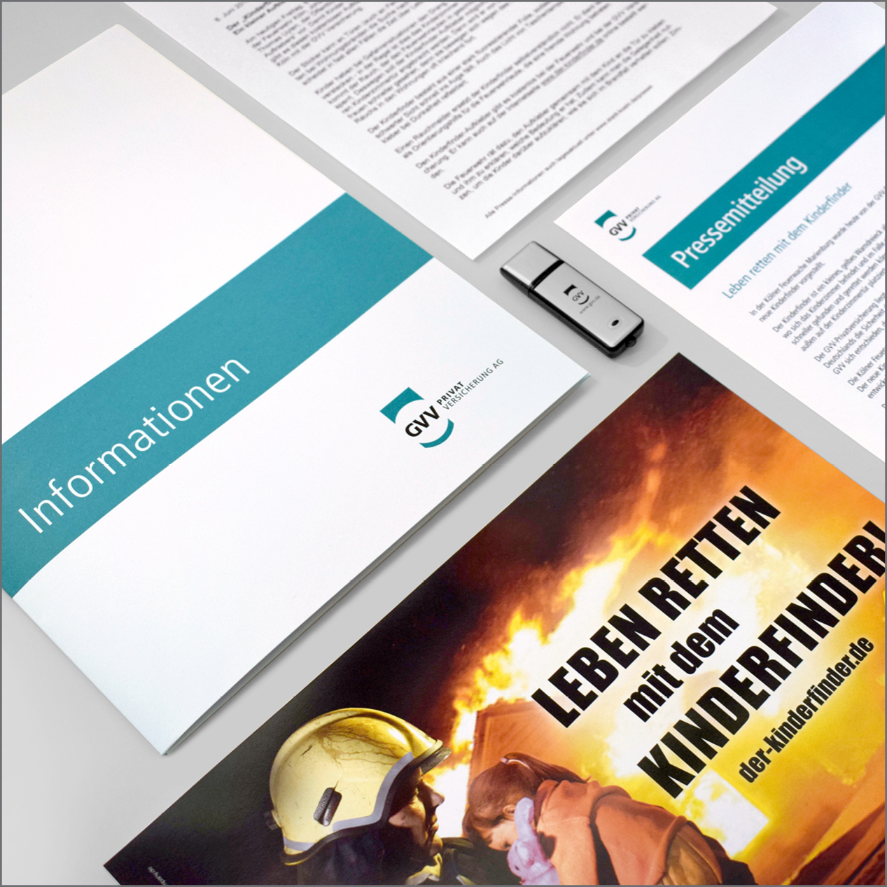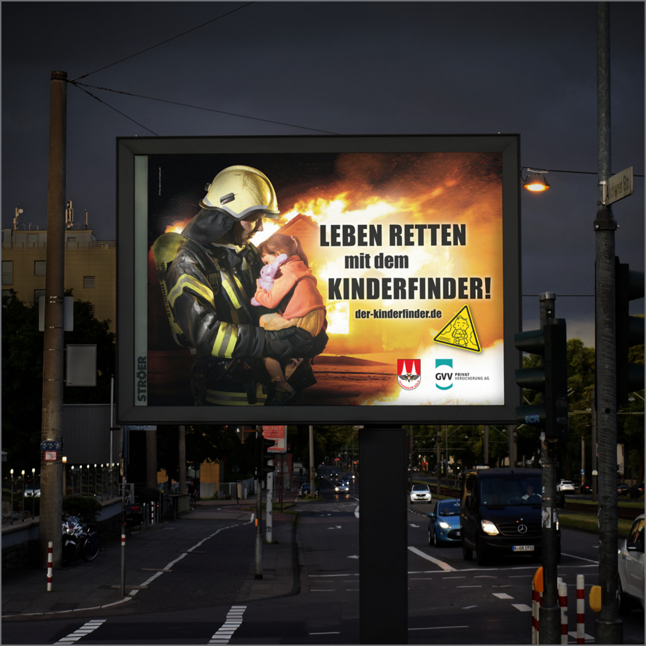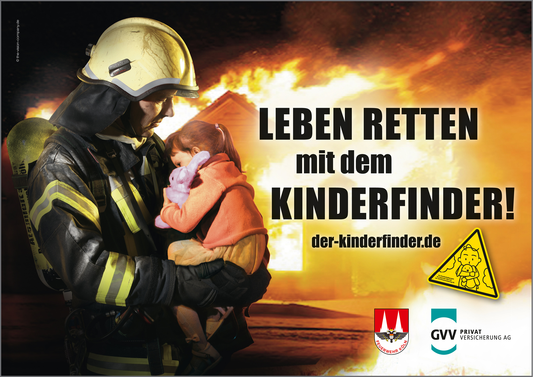 Für die GVV-Privatversicherung entwickelten wir in enger Zusammenarbeit mit der Kölner Feuerwehr den Kinderfinder, ein kleines, reflektierendes Warndreieck als Aufkleber. Der Kinderfinder soll dafür sorgen, dass Kinder in einem brennenden Haus durch die Rettungskräfte schneller gefunden und gerettet werden können. Das Medienunternehmen Ströer unterstützte die Aktion mit einer großangelegten Megalightkampagne. Wir übernahmen neben der Kreation des Kinderfinders auch die Plakat- und Flyergestaltung, das Fotoshooting, die Organisation der Pressekonferenz sowie die Produktion. Als besonderes Extra gab es bei der Pressekonferenz den Kinderfinder auch in essbarer Form – oben auf einem leckeren Cupcake!