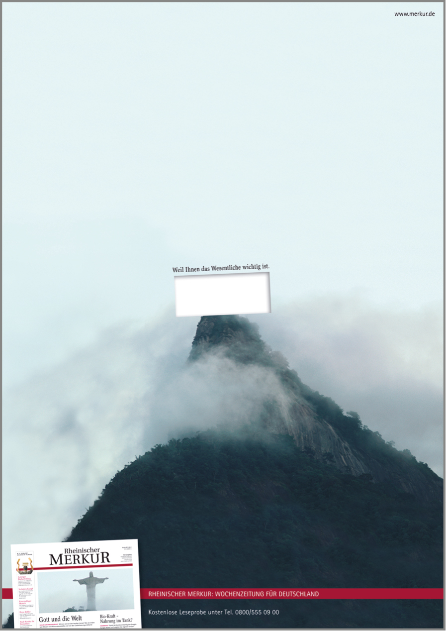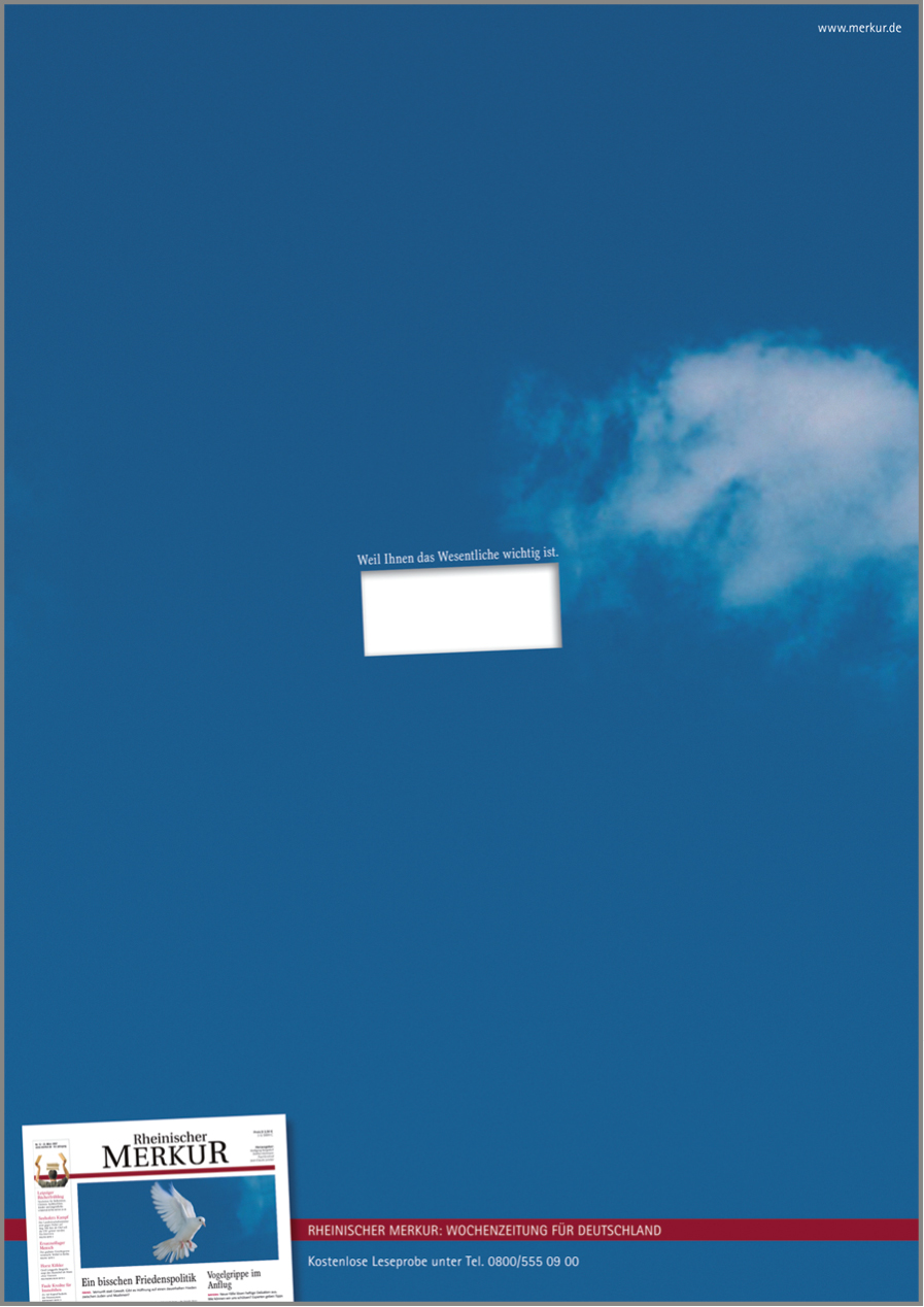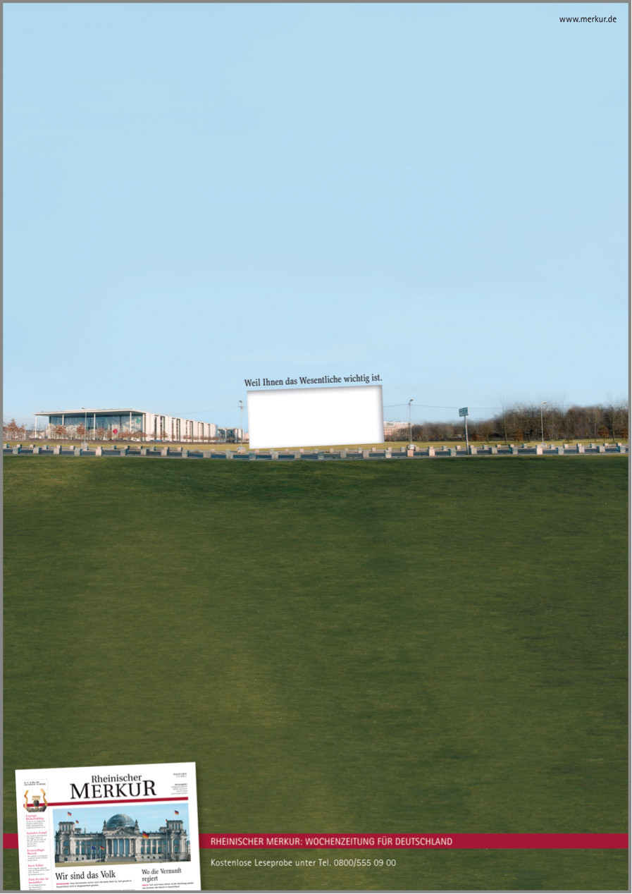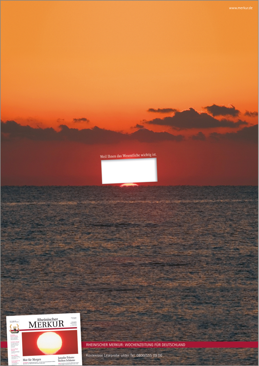 Mit unserer Kampagne „Weil Ihnen das Wesentliche wichtig ist.“ haben wir den Rheinischen Merkur als verlässliches Medium in der wachsenden Informations- und Nachrichtenflut positioniert. Die werteorientierte Kampagne überzeugte in der Wettbewerbspräsentation nicht nur Geschäftsführung und Marketing, sondern auch die Redaktion. Über mehrere Jahre wurden die Motive in zahlreichen Printtiteln geschaltet, der Radio-Spot lief auf vielen Sendern, der TV-Spot auf n-tv.