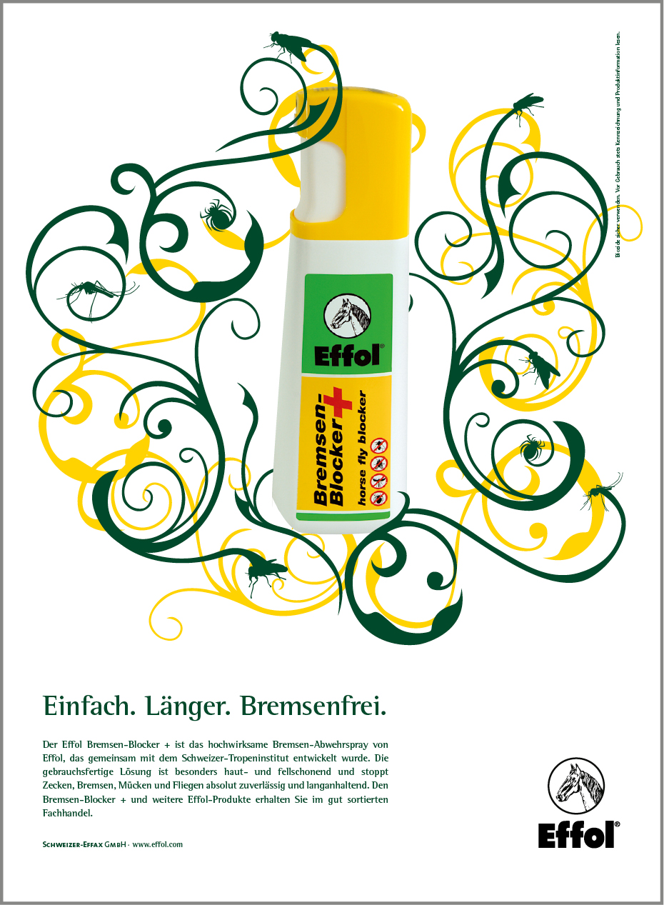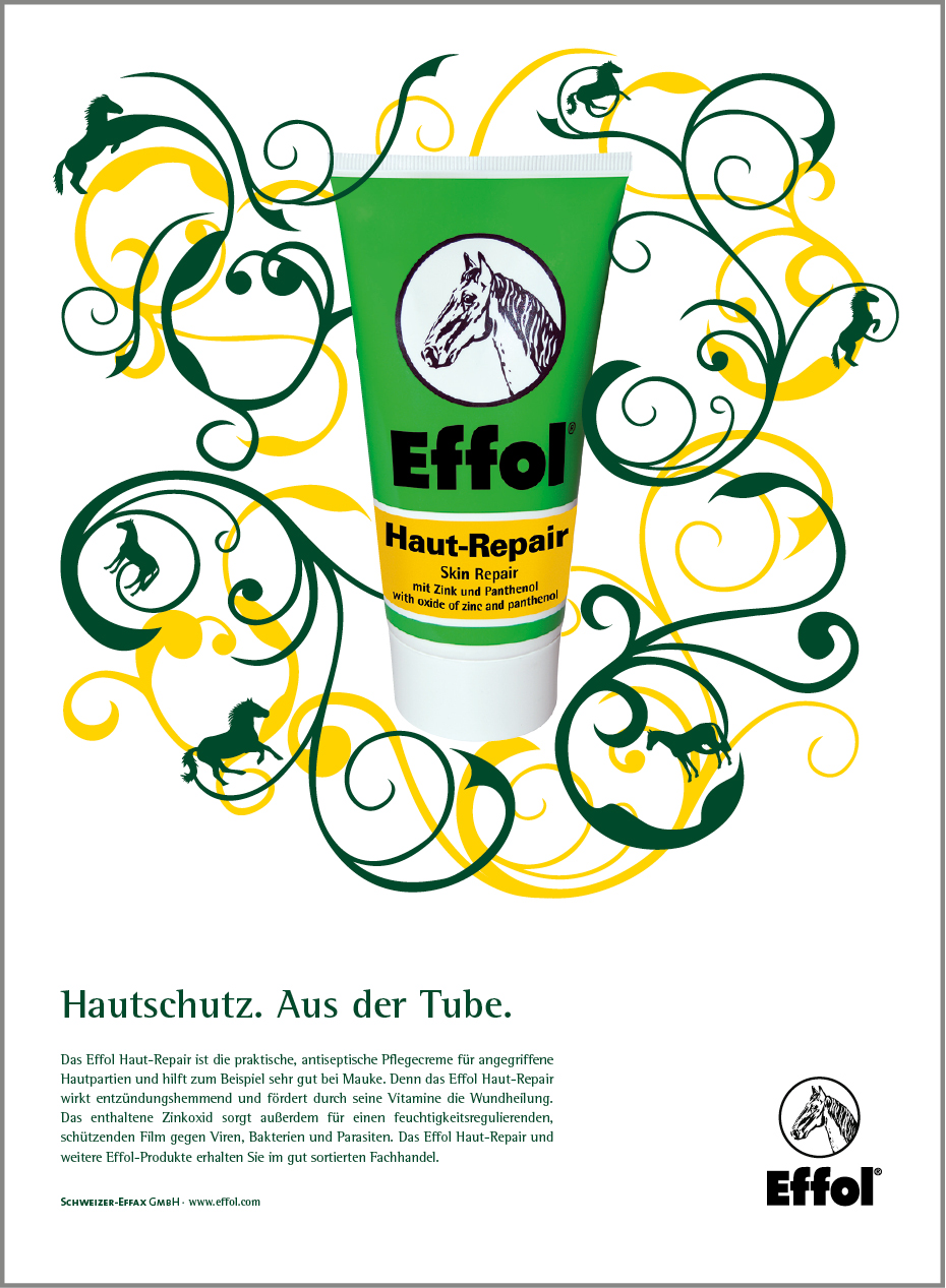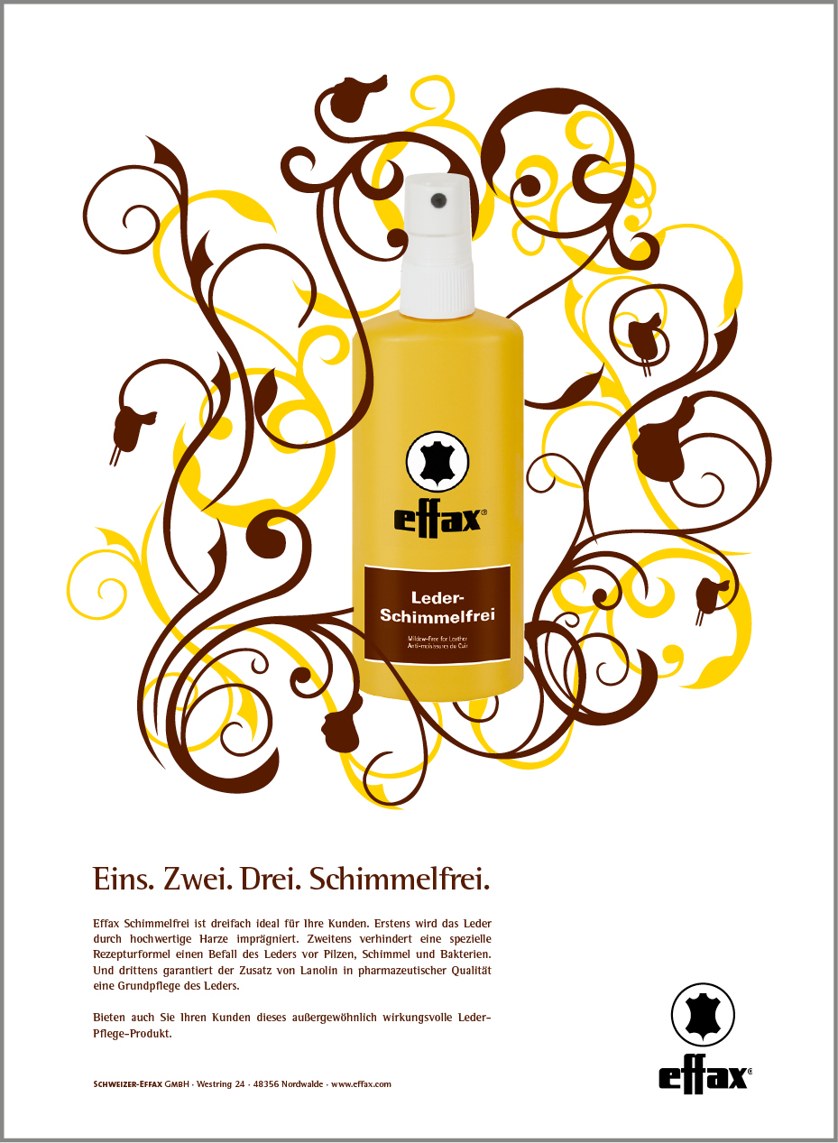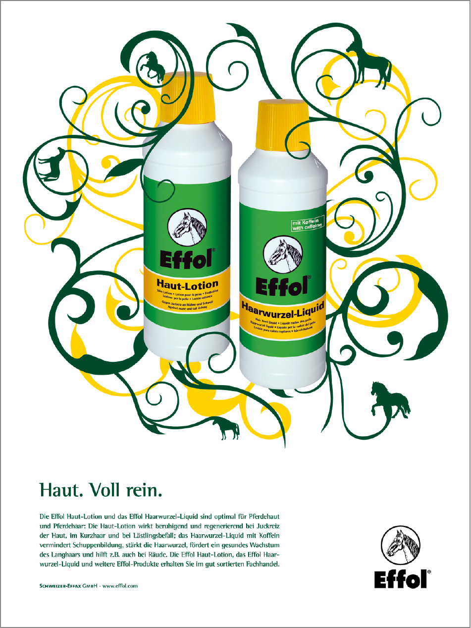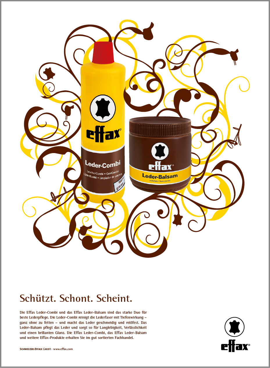 Für das Unternehmen Schweizer-Effax betreuten wir über einen Zeitraum von fünf Jahren die Marken Effol (Pferdepflege) und Effax (Lederpflege). Mit der von uns entwickelten und realisierten Kampagne „Organic“ setzte Schweizer-Effax für seine Pflegemittel innovative Akzente auf dem Reitsportmarkt. Die erfolgreiche Anzeigenkampagne wurde flankiert von Händler-Mailings, PoS- und Messestand-Designs, Produktkatalogen, Flyern sowie Produktdesigns, z.B. einer Pferdepflegeserie für Kinder.